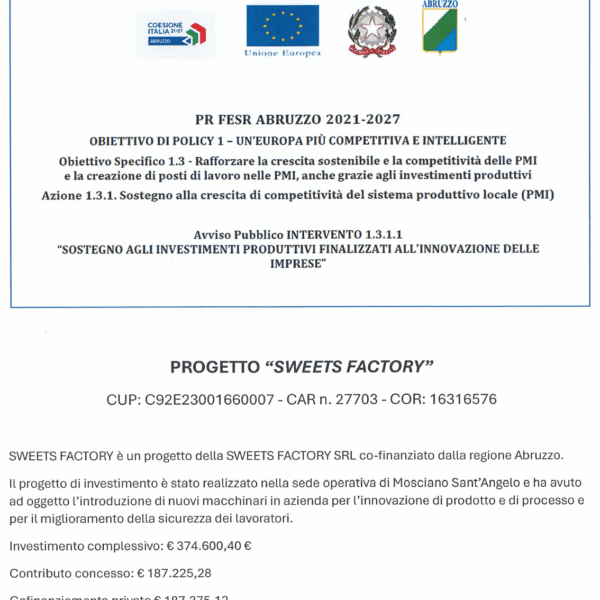 INNOVAZIONE E SICUREZZA CON IL PROGETTO “SWEETS FACTORY” GRAZIE AI FINANZIAMENTI OTTEN