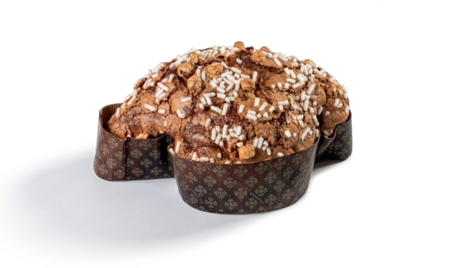 Prodotto lievitato con processo a cinque impasti arricchito da ganache al cioccolato e farina di nocciole glassato al cacao e nocciole.