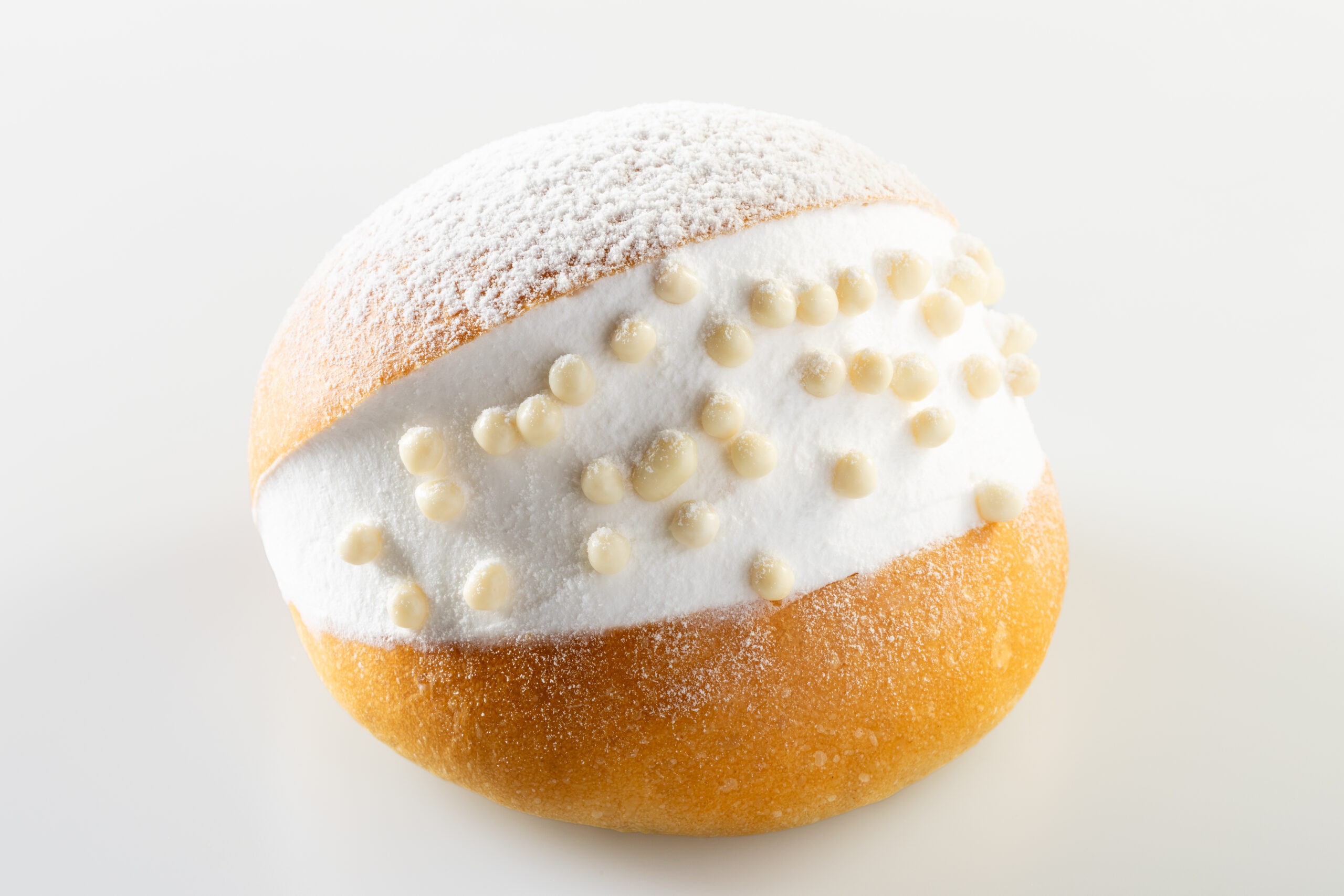 Maritozzo classico farcito con panna Galak (30,7%), inserto di crema Galak, decorato con cioccoriso Galak.
