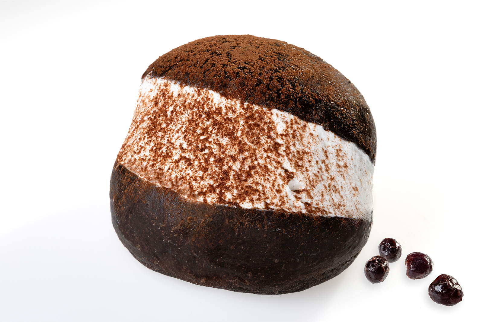 Maritozzo al cacao farcito con panna montata e gelée all’amarena.